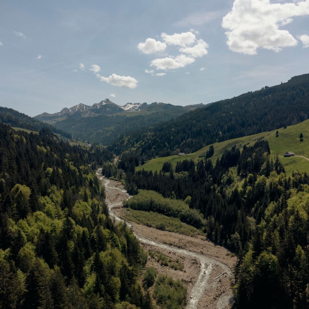Wir beginnen mit dem Abstieg über grüne Wiesen und durch kleine Wäldchen zum Bergrestaurant Gurli und anschließend noch weiter hinab, bis wir beim Zollhaus und der Sense ankommen. Bei einer kurzen Pause am Flusslauf laden wir unsere Energie auf, bevor der Aufstieg auf dem Gantrisch-Panoramaweg beginnt.