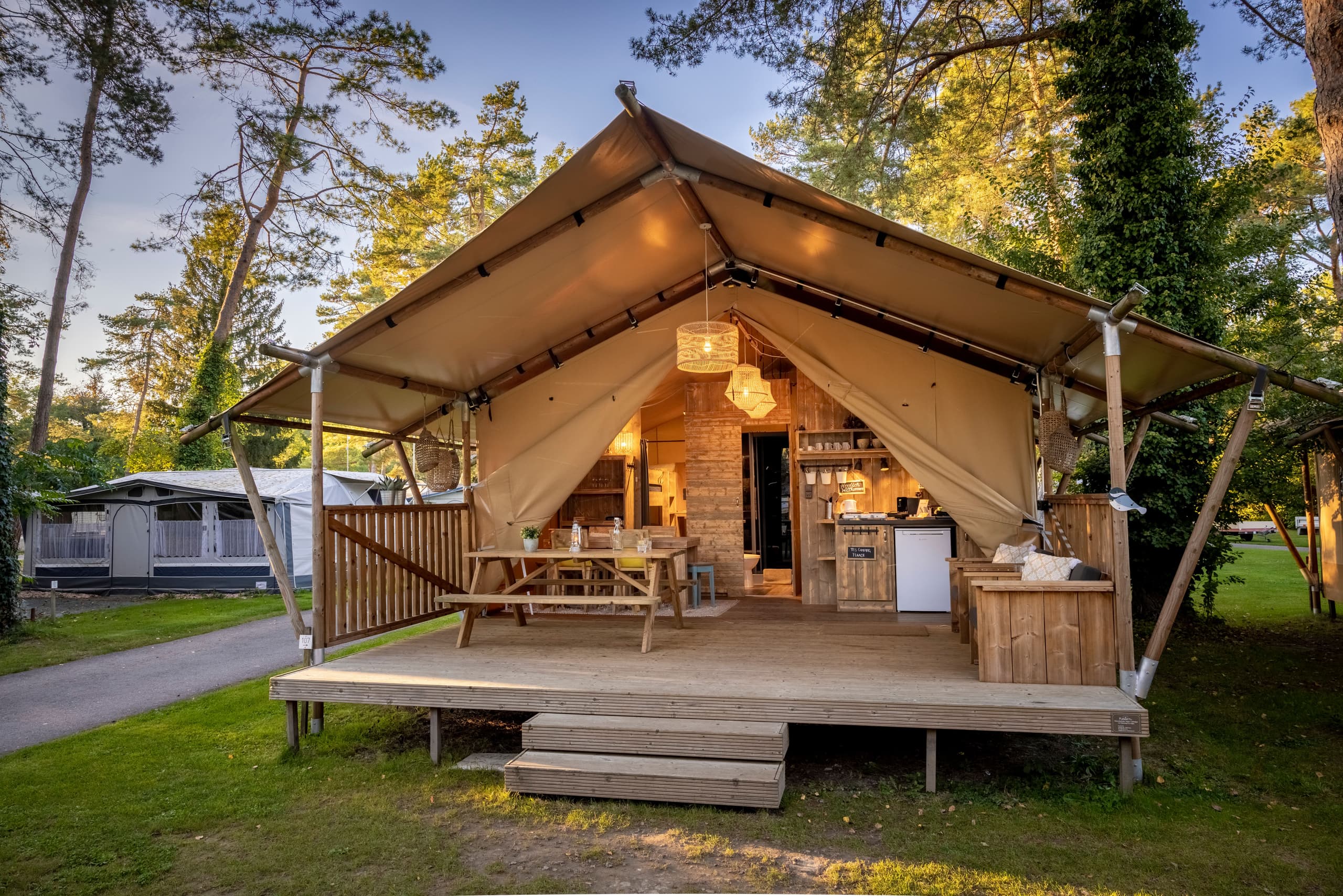 Soprattutto per quanto riguarda il "glamping", la tendenza a noleggiare alloggi di alta qualità, resistenti alle intemperie e dal design creativo, il TCS Camping assume un ruolo pionieristico nel mercato svizzero del campeggio. Il numero di alloggi in affitto Glamping - campeggio senza attrezzatura - del TCS Svizzera - dalla lussuosa tenda safari al carrozzone da circo al bungalow in legno di tendenza - cresce di anno in anno.
